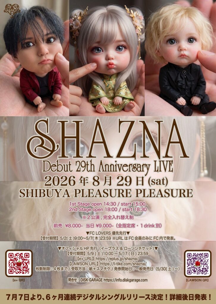 SHAZNAは、1997年8月27日にシングル『Melty Love』を発売し、メジャーデビューを飾った。あれから29年の歳月が経過。そのアニバーサリー記念としてSHAZNAは、8月29日(土)にSHIBUYA PLEASURE PLEASUREにて「Debut 29th Anniversary LIVE」を1日2公演行う。この日は、2公演ともヴィジュアルもセットリストも異なる内容を用意している。